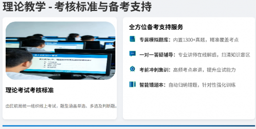配套打造的 1300 + 真题模拟题库,是提升通过率的核心支撑。题库全面覆盖民航法规、飞行原理等四大考试模块,精选历年真题、高频考点题,严格遵循考试分值占比与难度梯度,实时更新紧跟最新考试政策,剔除过时题目,让学员刷题更具针对性,快速掌握命题规律、熟悉考试节奏,有效提升答题能力。