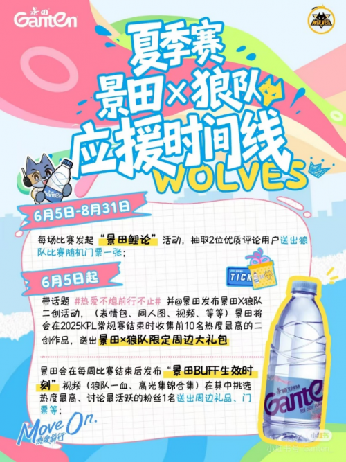 2024年,景田正式成为KPL年度官方合作伙伴,并荣获赛事指定饮用水称号。这一战略合作让景田迅速渗透电竞生态圈层。从选手桌上的矿泉水瓶到赛事直播画面的频繁露出,“健康补水”的理念贯穿整个赛事链条。此外,景田还独家签约十冠传奇战队重庆狼队,将“热爱前行”的品牌精神与战队奋斗故事相结合。这种“双向赋能”的合作模式,不仅提升了品牌在电竞玩家群体中的认知度,也通过励志的战队故事拉近了品牌与年轻消费者之间的距离。